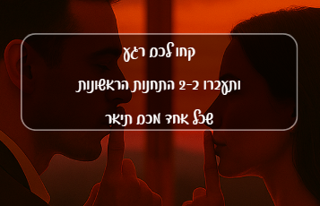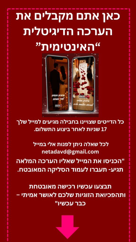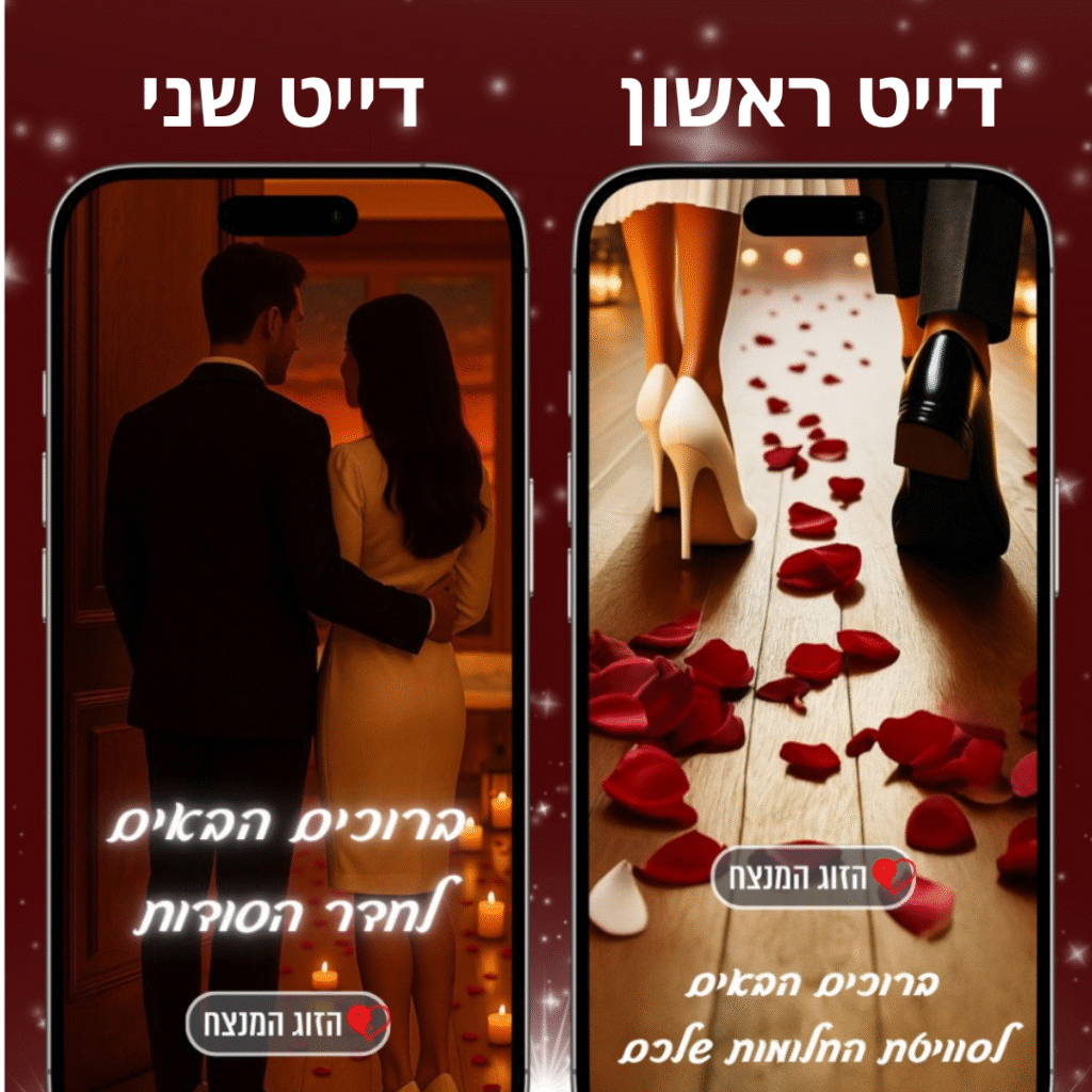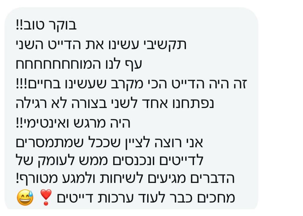 🎯 הדייט הזה עובד – כי הוא מבוסס על כלים מקצועיים של ייעוץ זוגי, שנארזו לתוך חוויה קלילה שתגרום לכם להרגיש הכי קרובים שאפשר!