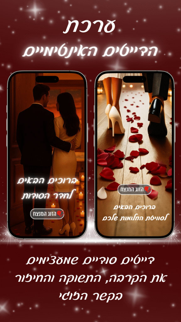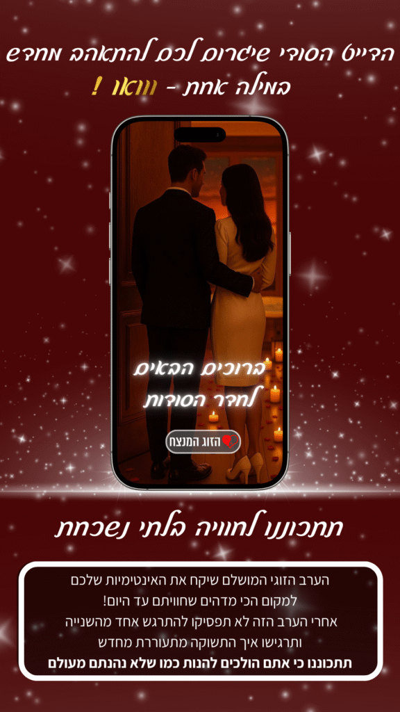 לא עוד “שיחה על יומיום” ולא עוד “מה אוכלים מחר”, אלא דייט אינטימי שמחזיר אתכם אחד אל השנייה – עם מבטים, מגע מדויק, חיוך של קרבה, ורגעים שתזכרו לתמיד.