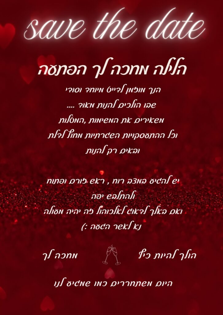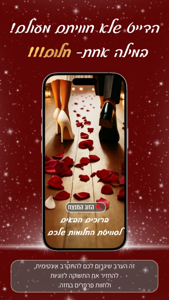 זה לא “עוד ערב זוגי” – זו חוויה מקרבת, חושנית, שתגרום לכם להתקרב, לגעת, לשתף, לרצות.