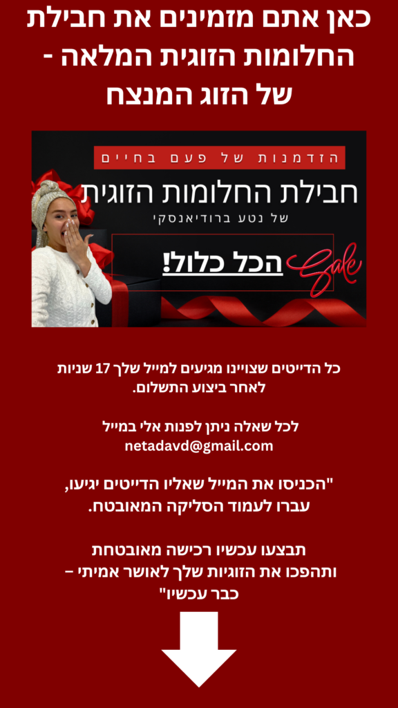 במחיר המיוחד הזה את מקבלת את כל החבילה, כולל כל הדייטים, כל ההנחיות וכל התוכן – בדיוק כמו שמוצג.